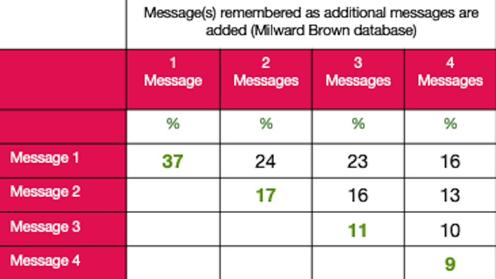 The more messages an ad attempts to communicate, the lower the likelihood of any single message being communicated strongly and remembered.